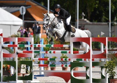 Egész hétvégén kiváló formában ugrott a tízéves szürke kancánk. Hibátlan alappálya után az összevetés leggyorsabb négyhibapontos lovaglásával megnyerték a 150 cm-re kiírt, 1,5 millió forint összdíjazású Nagydíjat, így megismételték a tavalyi eredményt.