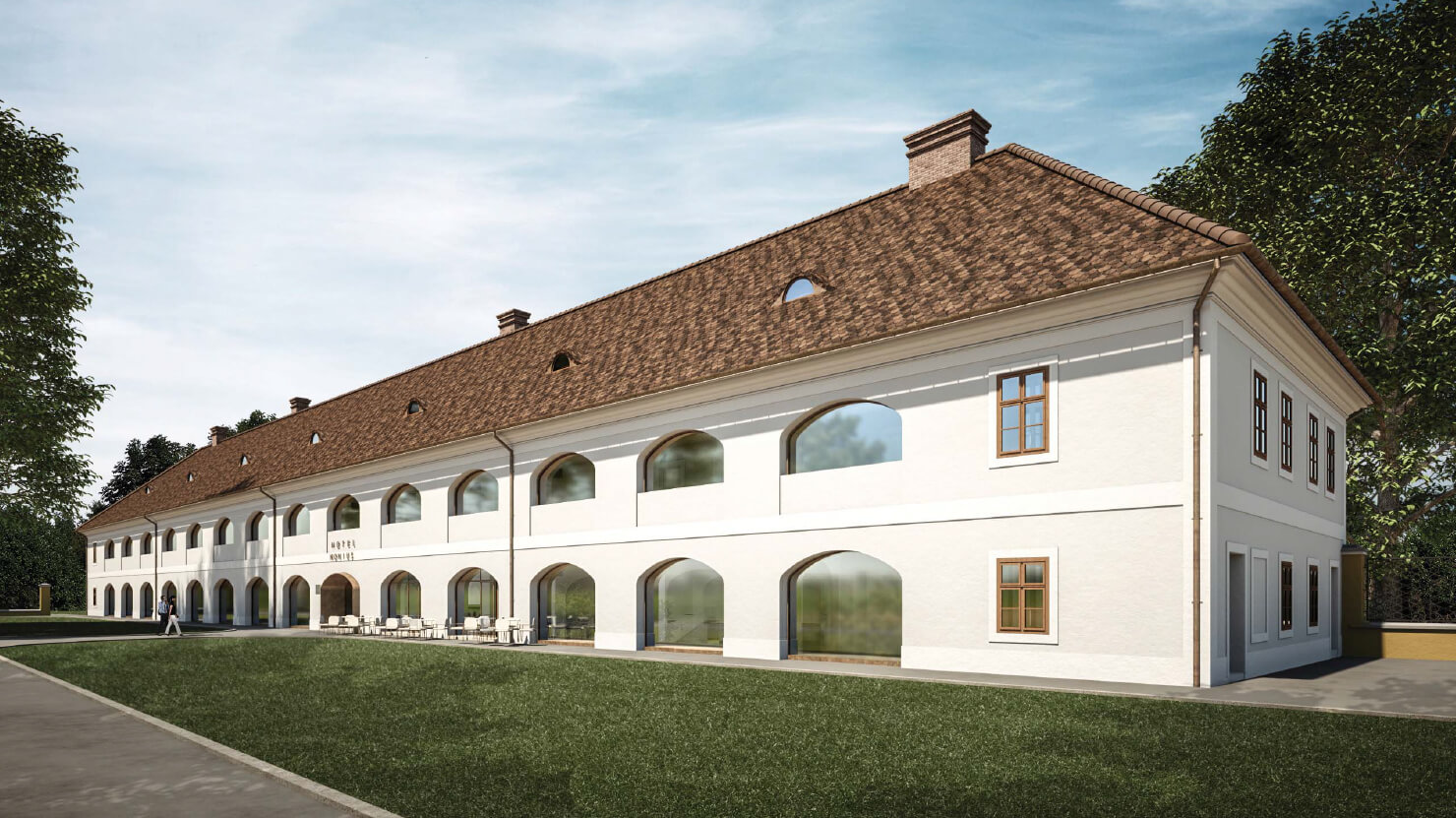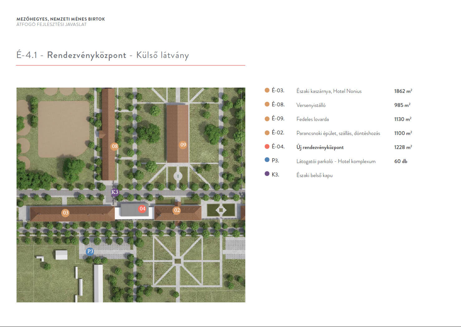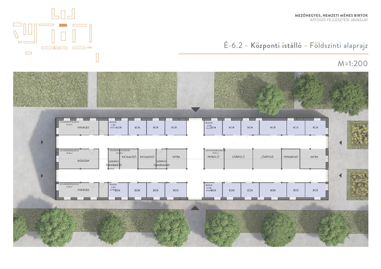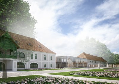 A Ménesbirtok központjának átfogó fejlesztési tervéről szóló cikksorozatunk második részének címében Féja Gézától idéztünk. A beruházások második ütemében a központi ménesudvar, régi nevén a Csekonics-udvar fog megújulni. Megújul a Versenyistálló, a Keleti lóistálló a kocsiszínnel, illetve visszakapja eredeti funkcióját a Fedeles lovarda mögötti Központi istálló. Katona András, a DAW Építész Stúdió vezető építésze beszámolt róla, hogy a falkutatás során megtalálták a befalazott, eredeti öntöttvas oszlopokat. Céljuk az eredeti állapot és funkció helyreállítása. A Keleti istálló egyik kocsiszínjében és az istálló előterében kávézó is működik majd, ahonnan vendégeink közelről szemlélhetik a lovakkal dolgozó szakemberek, vagy éppen a Ménesbirtoknál tanuló diákok munkáját. Lázár János kormánybiztos úr valamennyi folyamatban és tervezési fázisban lévő projektünk kapcsán alapvető igényként fogalmazta meg, hogy a mintagazdaság üzemeit, telephelyeit, létesítményeit bejárhatóvá kell tenni – egyrészt a szakmai közönség, másrészt a turisták számára. A Ménesparancsnokság is ennek megfelelően illeszkedik a koncepcióba. A jövőben egy négycsillagos szállodakomplexum és rendezvényközpont részeként fog működni. A parancsnoki épületben egy 64 fős rendezvénytermen kívül exkluzív szálláshelyek létesülnek. Teljesen megújul a Hotel Nonius is, így összesen 34 szoba áll majd az ide látogatók rendelkezésére. A két épületet egy üvegfalú, új rendezvényközpont kapcsolja össze, amely alkalmas lesz nagyobb rendezvények, például szakmai konferenciák, esküvők befogadására. A tervek első változata szerint a szállodakomplexum részeként a rendezvényközpont pincéjében rekreációs központ létesül edzőteremmel, szaunával, medencékkel. Katona András és munkatársai a nagykovácsi Teleki-Tisza kastély két bástyája közötti emeleti részen már terveztek hasonló rendezvényteret. Az üvegből készült homlokzat Mezőhegyesen visszatükrözi a műemlék épületek és a fák képét; a könnyed, elegáns, mondhatni légies szerkezet a megfelelő arányokkal illeszkedik a Ménesudvar épített örökségéhez.