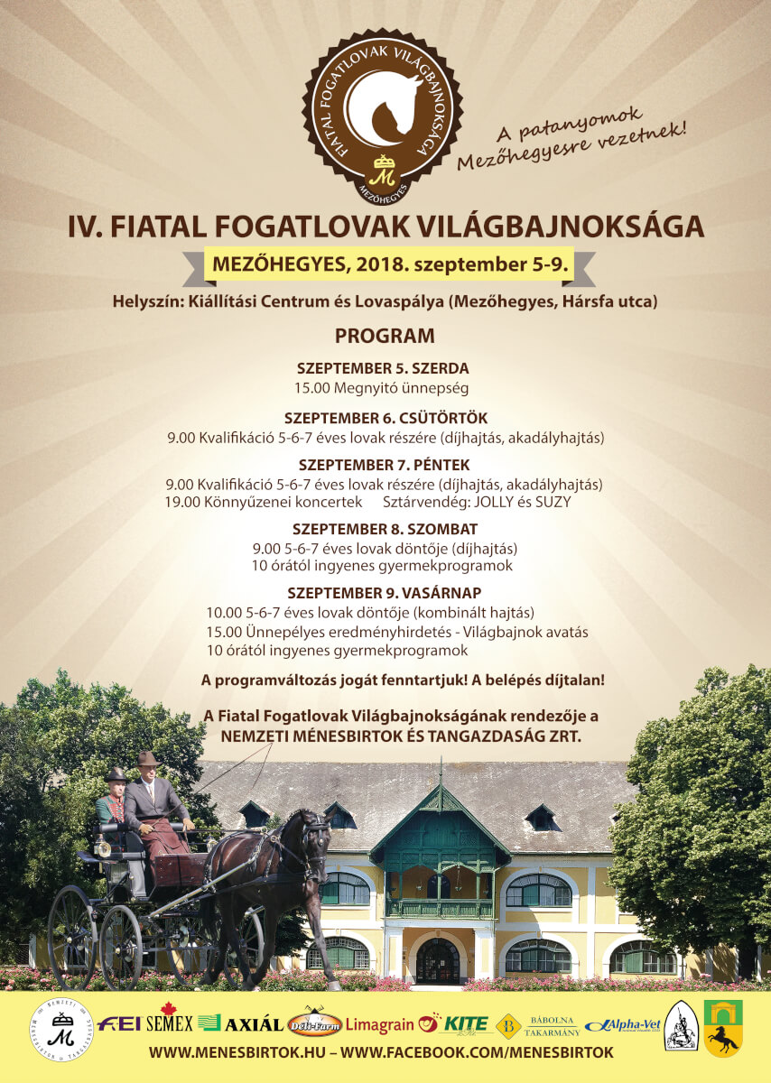 Már csak néhány hét és elkezdődik a IV. Fiatal Fogatlovak Világbajnoksága Mezőhegyesen, amelynek szeptember 5. és 9. között a Nemzeti Ménesbirtok és Tangazdaság Zrt. lovaspályája ad otthont. Az állami tulajdonú cég 5 évre nyerte el a szervezés jogát, így 2019-ig biztosan a Nemzeti Ménesbirtok és Tangazdaság Zrt. szervezi világversenyt. Az előkészületek jól haladnak.